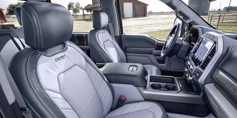 The 2022 Ford F-250 comes in one of six different trims: XL, XLT, Platinum, Limited, Lariat, and King Ranch. Each trim includes multiple exterior design features that make them an attractive and tough truck. For example, you get chrome-steel front and rear bumpers, black door handles, a chrome grille, dual-beam halogen headlamps, automatic high-beam headlamps, manual telescoping mirrors, power tailgates, and even tie-down hooks for the bed. You also get LED roof clearance lights, a front license plate bracket, and BoxLink to protect your bed and keep it safe from various weather-related issues.